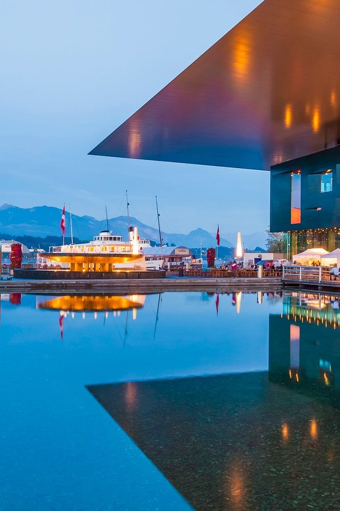 Centre de culture et de congrès KKL Lucerne, architecte Jean Nouvel, sur le lac des Quatre-Cantons à Lucerne, Suisse.