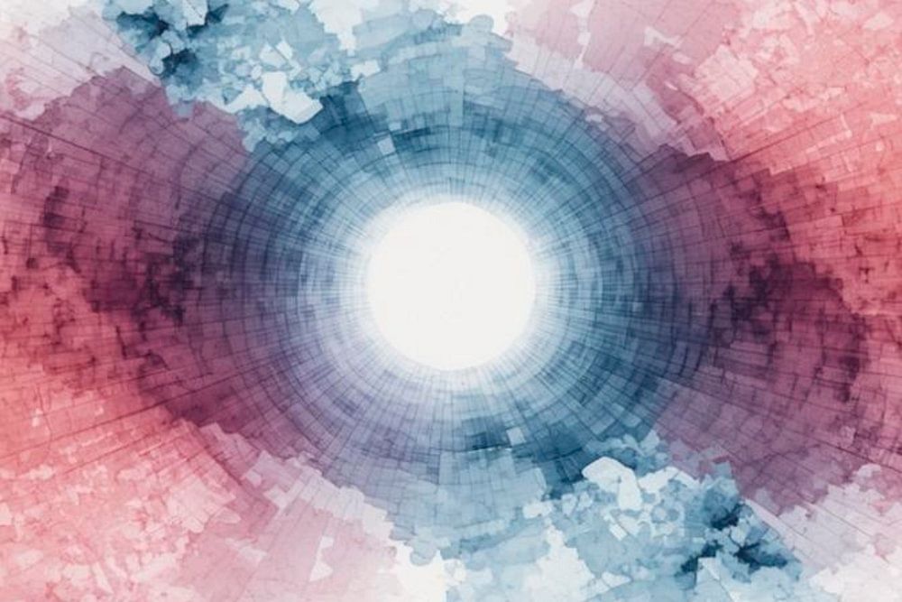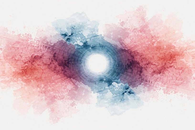 Au centre de cette œuvre se trouve un noyau lumineux intense, presque rayonnant. De là, des lignes concentriques et des structures fines se propagent de manière circulaire, comme des vagues qui s'étendent dans une eau calme. Autour de ce centre se déploie un champ de tension entre le bleu froid et les tons chauds de rouge et de rose.…