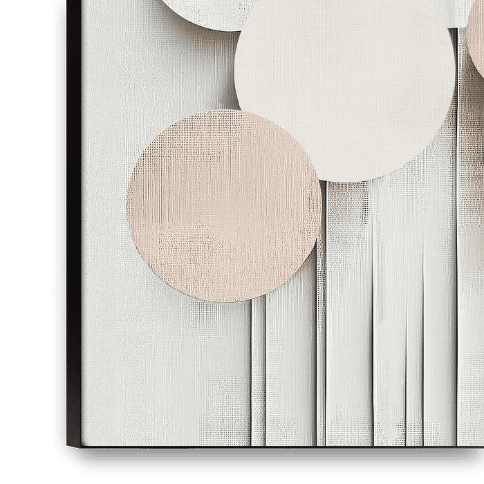 Les cercles, chacun étant une interprétation abstraite de pétales en pleine floraison, se déplacent sur la surface dans un rythme ludique, presque méditatif. Certains se chevauchent, d'autres flottent dans l'espace, comme les fragments d'un souvenir d'un jardin de fleurs paisible. Les accents subtils de bleu et de violet ajoutent de la profondeur et du contraste, sans perturber la douce sérénité de l'ensemble.
