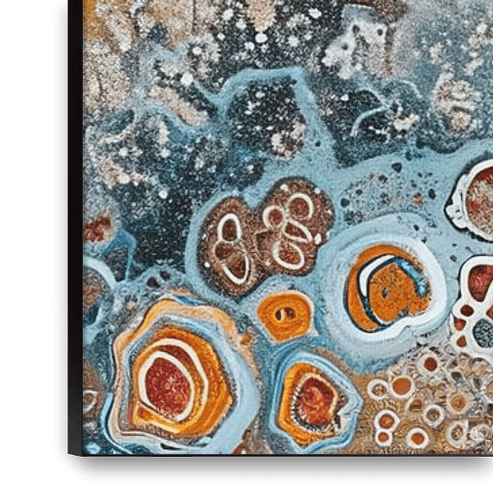 Cercles abstraits - Cette œuvre d'art abstraite joue avec un mélange captivant de formes et de textures de cercles organiques, créant un effet de profondeur intriguant. Les transitions de couleurs entre les oranges et les rouges chauds et les bleus plus froids créent un spectacle visuel dynamique, les lignes blanches créant un lien subtil entre les champs de couleurs.
