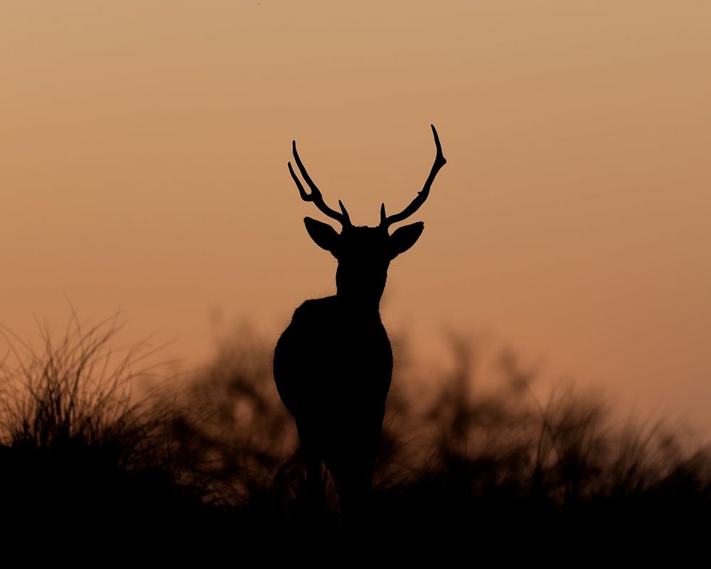Cerf contre le soleil couchant (contre-jour) à l'heure dorée.