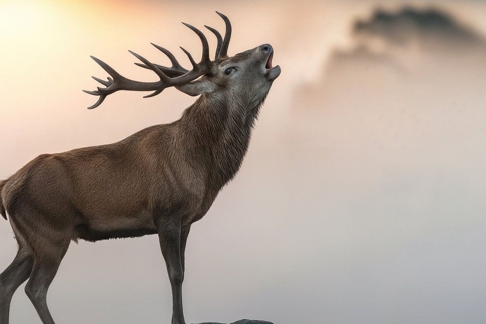 Un cerf rouge, debout sur des rochers, rugit, se détachant sur un lever de soleil et un paysage de brouillard.