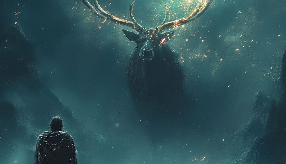 La troisième image montre une scène surréaliste dans un paysage nocturne couvert de neige. Au premier plan, un personnage solitaire, enveloppé dans une cape sombre, lève les yeux vers un cerf gigantesque et rayonnant, dont les bois brillent comme un ciel étoilé scintillant. Cet animal majestueux semble venir des profondeurs de l'univers, entouré d'une aura de particules lumineuses qui rappellent les aurores boréales. La scène est imprégnée d'un sentiment de respect et d'émerveillement et suggère un monde dans lequel le merveilleux et le surnaturel font partie du quotidien.