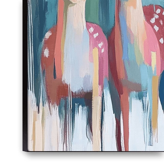 Cerfs roses tachetés - Sur cette peinture animalière, vous pouvez voir trois cerfs joyeux au pelage rose et tacheté de blanc, sur un fond coloré aux tons bleus et verts qui évoquent une ambiance estivale.