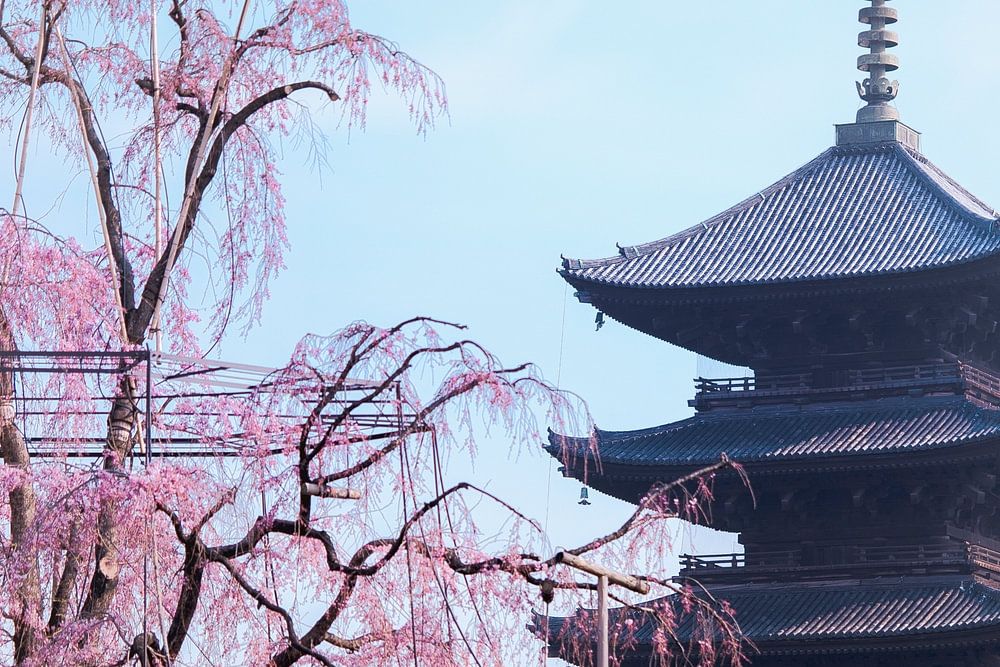Un vieux cerisier pleureur rose soutenu par une accolade en bois et la pagode à cinq étages du temple Toji entourée de fleurs de cerisier pendant la saison du hanami à Kyoto.