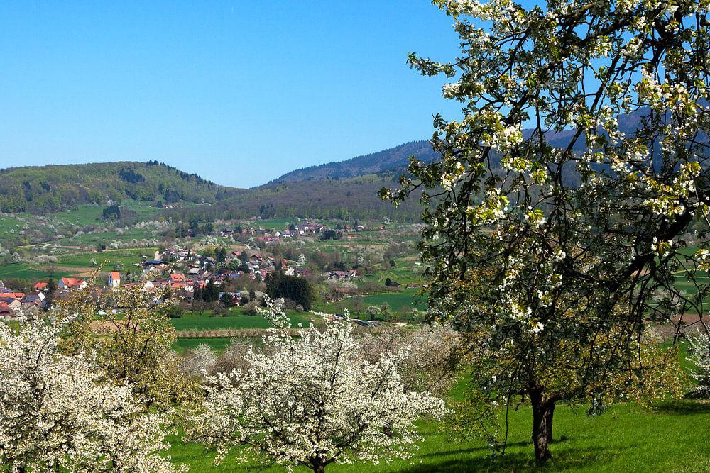 Cerisiers en fleurs, vue sur Obereggenen, Markgräflerland, Forêt-Noire, Bade-Wurtemberg, Allemagne