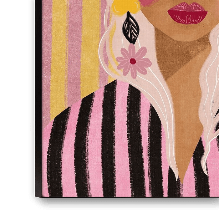 Illustration d'un portrait de femme aux cheveux blond cendré, haut rayé, sur fond rayé avec de grandes boucles d'oreilles à fleurs.