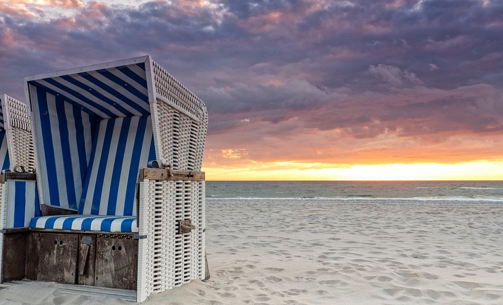 Chaises de plage au coucher du soleil sur la plage de Kampen.