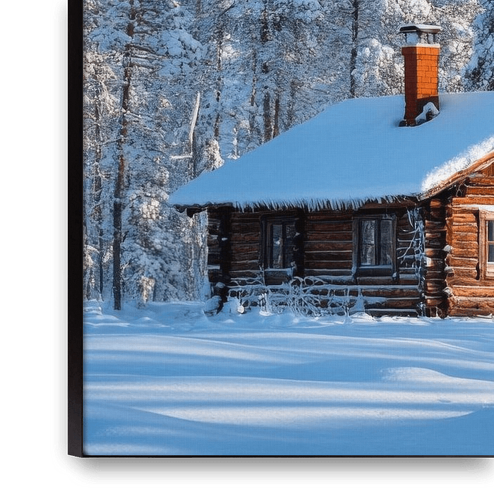 Une pittoresque maison en bois, entourée d'arbres enneigés et d'un paysage hivernal scintillant, dégage une impression de chaleur et de sécurité. La fumée qui s'élève de la cheminée évoque des soirées douillettes au coin du feu. Cette scène romantique convient parfaitement au salon pour créer une atmosphère accueillante et détendue.