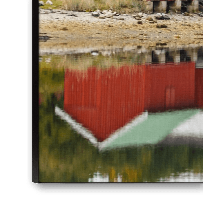 Les hangars à bateaux norvégiens le long d'un fjord, peints dans les couleurs scandinaves bien connues. Le reflet dans l'eau et les magnifiques couleurs d'automne complètent le tableau.