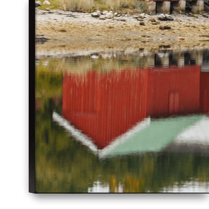 Les hangars à bateaux norvégiens le long d'un fjord, peints dans les couleurs scandinaves bien connues. Le reflet dans l'eau et les magnifiques couleurs d'automne complètent le tableau.