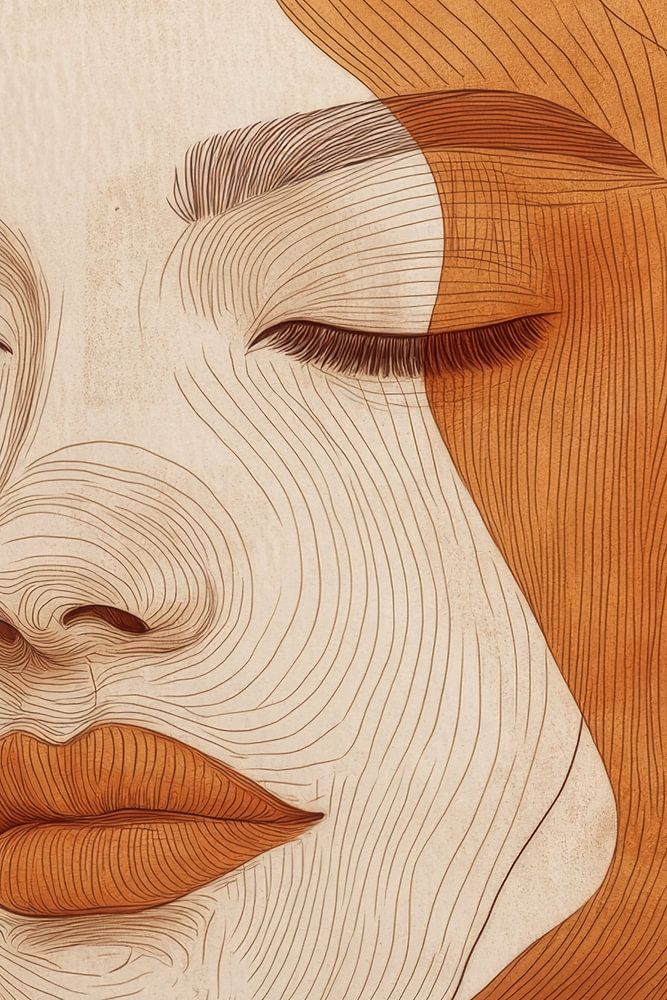 Ce portrait serein d'une femme combine des lignes douces et des tons orange chauds avec une aura calme. Ses yeux fermés et son expression détendue dégagent un sentiment d'introspection et d'harmonie. Les contours fluides et les textures subtiles de son visage et de ses cheveux créent un jeu dynamique de mouvement et d'équilibre. Cette œuvre d'art est le complément parfait d'un intérieur qui veut respirer la chaleur, la sophistication et l'expression artistique.