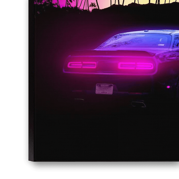 Dodge Challenger mauve au coucher du soleil : Une Dodge Challenger vue de l'arrière, avec des feux arrière violets, garée sur un magnifique coucher de soleil tropical violet et orange, encadré par des silhouettes de palmiers.