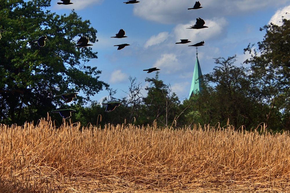 Vue sur un champ de céréales à Gelsenkirchen-Resse en direction de la flèche de l'église de Westerholt.