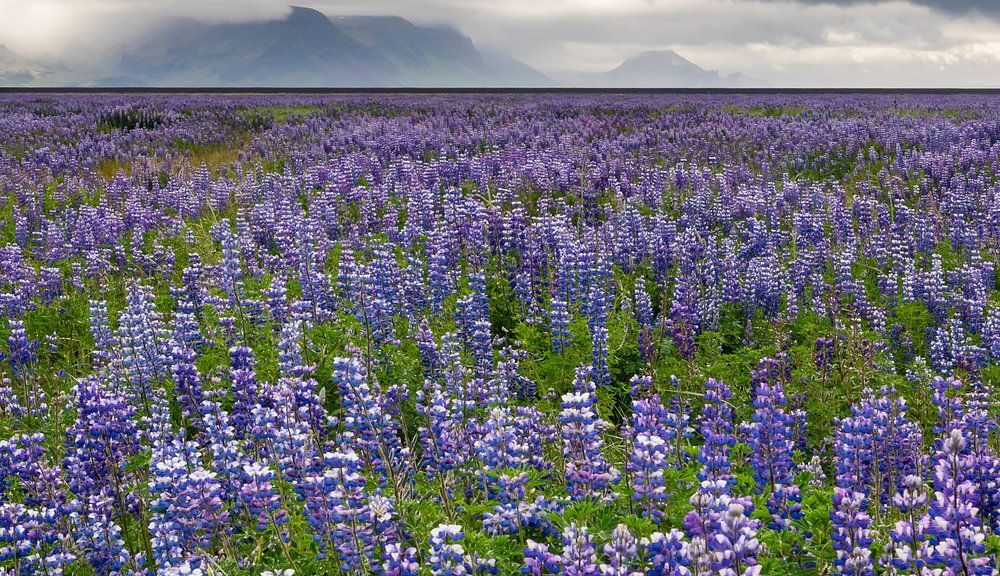 Champ de fleurs de lupin violet sur un grand champ de lave en Islande avec tonnerre sombres nuages et les montagnes.