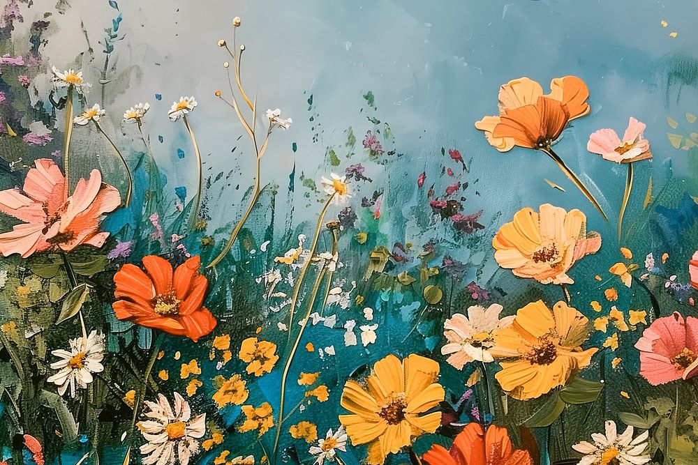 Dans les couleurs vives du printemps, les champs de fleurs s'animent. Une mer de fleurs jaunes, roses et bleues donne une image joyeuse et accueillante. Le soleil brille, jetant une lumière chaude sur les fleurs épanouies. Dans cette scène idyllique, la beauté de la nature est mise en valeur. Les couleurs sont si vives que l'on a l'impression de sortir directement du tableau et de sentir la chaleur du soleil sur sa peau.
