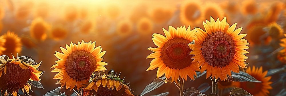 Un vaste champ de tournesols à l'heure dorée avec des couleurs vives et un coucher de soleil dramatique en arrière-plan.
