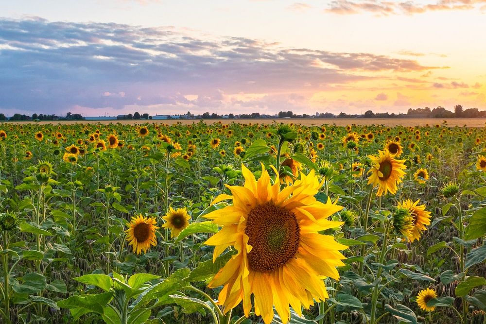 Belle soirée d'été dans la campagne hollandaise, avec les derniers rayons de soleil de la journée tombant sur le champ de tournesols.