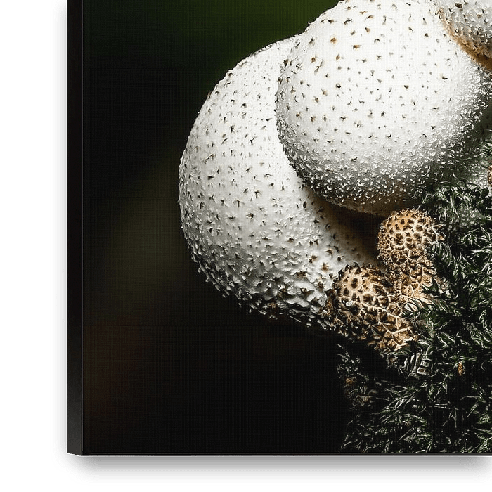 Macro photographie d'un groupe de champignons comestibles appelés "Bottle Staphs" (LYCOPERDON PERLATUM). Ce motif convient non seulement comme peinture murale, mais aussi comme poster ou papier peint de photo.