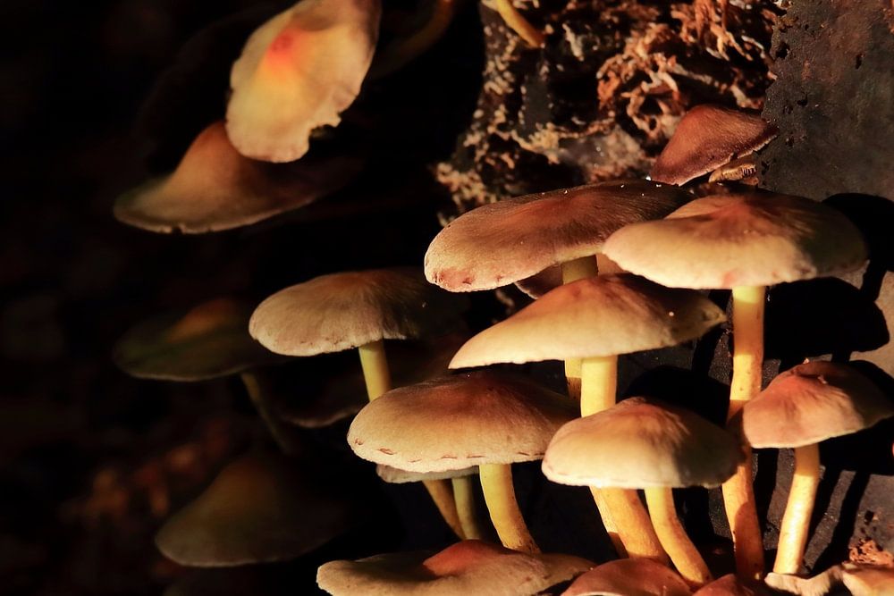 Champignons brun clair poussant sur un arbre dans la forêt. Ils sont éclairés par un rayon de soleil tombant à travers les branches de l'arbre.