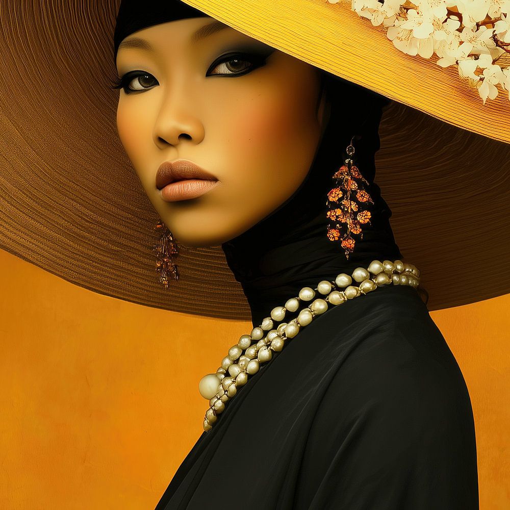 Avec un look qui ne laisse rien au hasard, cette femme pose sous un gigantesque chapeau jaune rempli de fleurs blanches. Les bijoux luxueux font d'elle une figure majestueuse d'un autre temps ou d'une autre dimension.