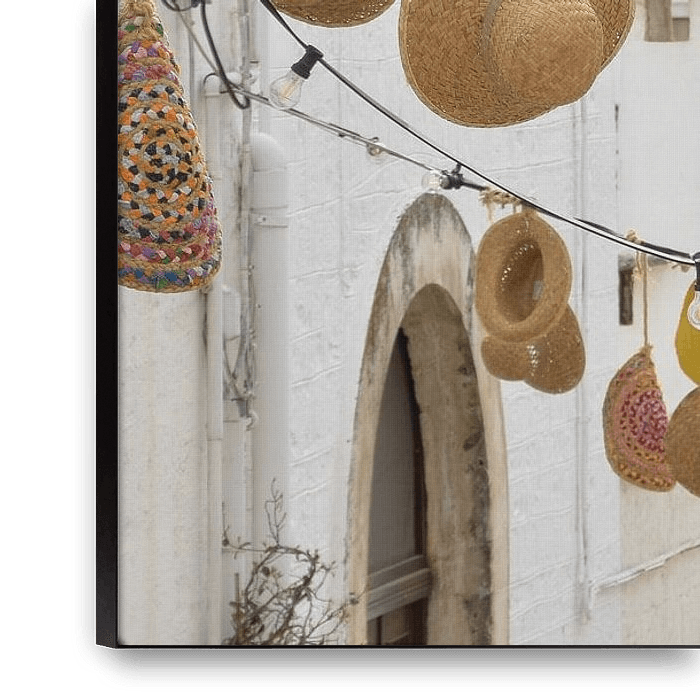 Image de chapeaux d'été dans les rues d'Alberobello, dans les Pouilles, en Italie.
