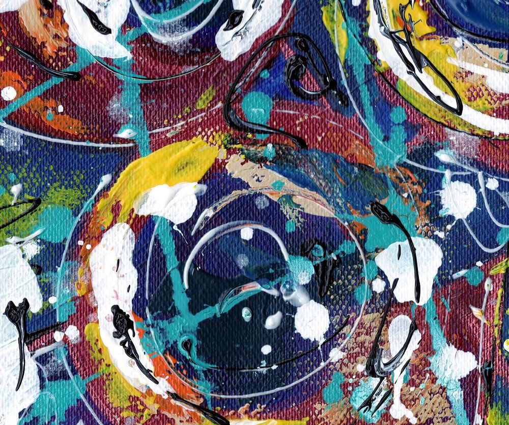 Het kleurenpalet van rode, blauwe, groene en oranje tinten draagt bij aan de rijke symboliek van het kunstwerk. Rood kan de passie en intensiteit van menselijke emoties vertegenwoordigen, terwijl blauw rust en contemplatie suggereert. Het frisse groen symboliseert groei en vernieuwing, terwijl het levendige oranje staat voor energie en vitaliteit. Samen creëren deze kleuren een harmonieus samenspel van gevoelens en ervaringen.