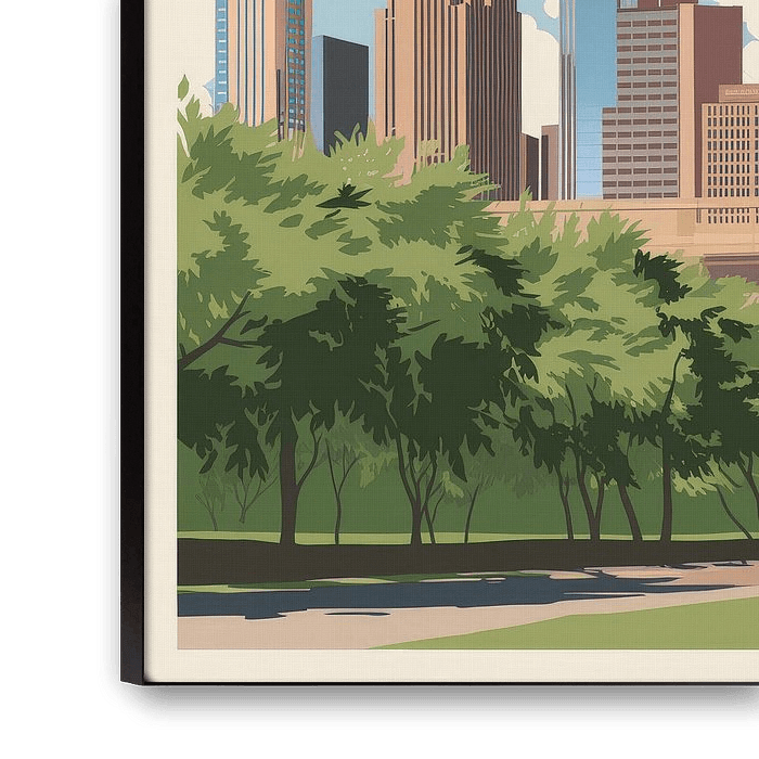 La ligne d'horizon de Charlotte dégage une atmosphère urbaine, entourée d'une verdure luxuriante et d'un ciel d'un bleu éclatant. Cette représentation artistique est parfaite pour le salon afin d'apporter une touche de vie urbaine trépidante et de chic moderne. Un véritable accroche-regard qui stimule les conversations et anime l'ambiance.