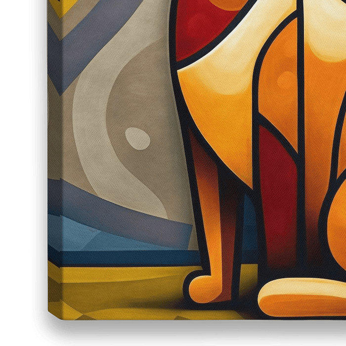 Illustration colorée d'un chat dans le style surréaliste de Pablo Picasso. Technique mixte abstraite dans les tons bleu, jaune et orange sur papier.