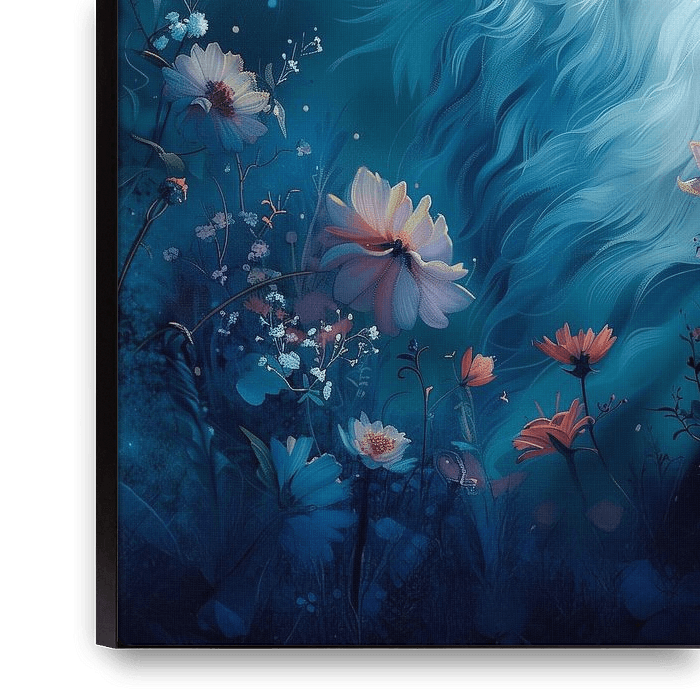 Cette illustration montre un chat blanc et gracieux entouré d'un monde de rêve fait de fleurs et d'un doux clair de lune. Son pelage soyeux brille dans des tons bleus froids, tandis que les fleurs aux couleurs chaudes qui l'entourent créent un contraste harmonieux. Le chat regarde calmement et attentivement vers le haut, comme s'il…