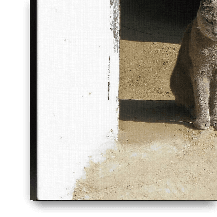 Chat gris bénéficie de la lumière du soleil en fin de journée sur le seuil de sa maison