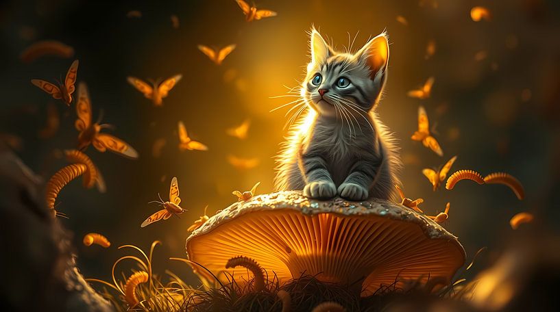 Un chat égaré est assis sur un champignon dans un décor surréaliste, digne d'un conte de fées.