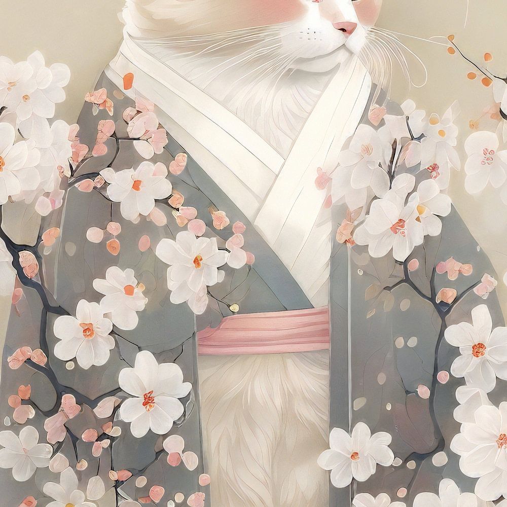 Illustration fantaisiste d'un doux chat en kimono entouré de fleurs de Sakura. Technique mixte dans des tons doux de crème, rose et saumon.)