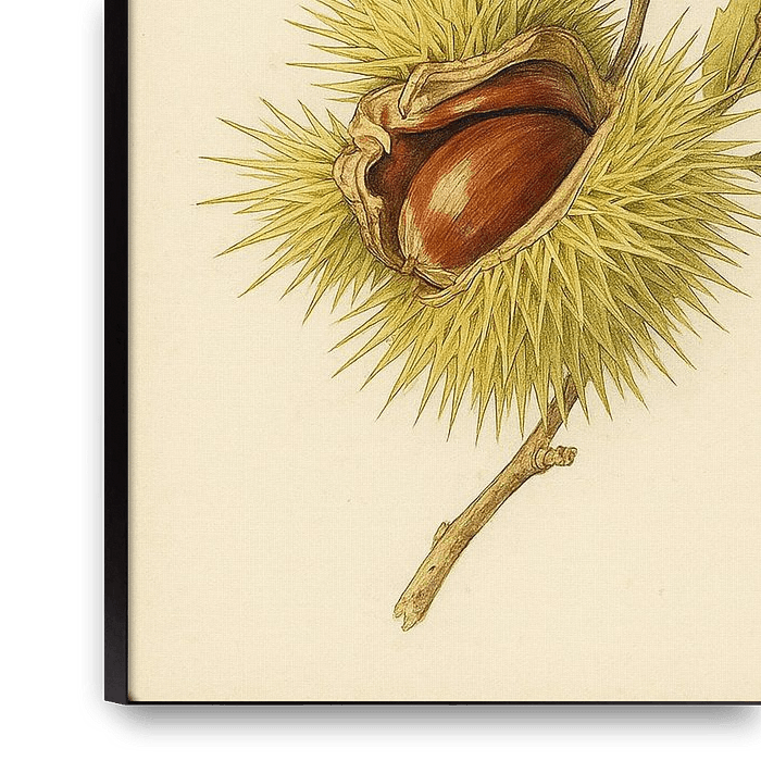 Une illustration sophistiquée dans un style botanique classique, avec des aquarelles douces et des accents d'encre précis. La châtaigne, l'enveloppe et les feuilles sont fidèlement rendues, avec une attention particulière à la texture, à la forme et aux détails. L'ensemble a l'aspect d'une assiette botanique traditionnelle du 18e ou du…