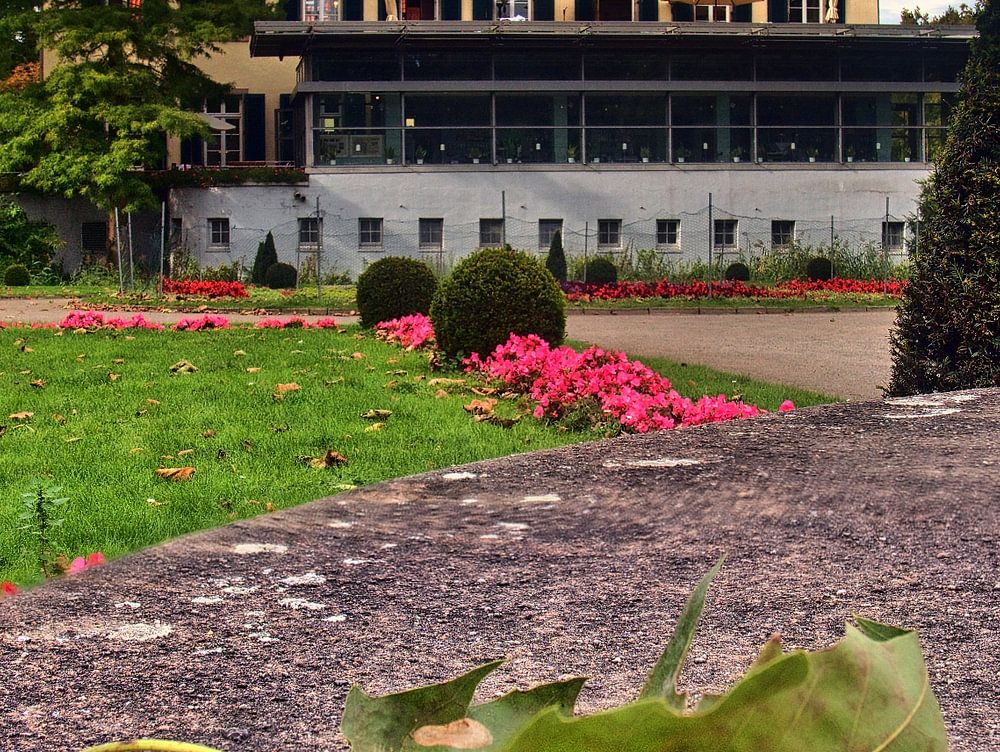 Schloss Berge à Gelsenkirchen en automne avec un angle de caméra bas et deux niveaux de mise au point montés en un seul.