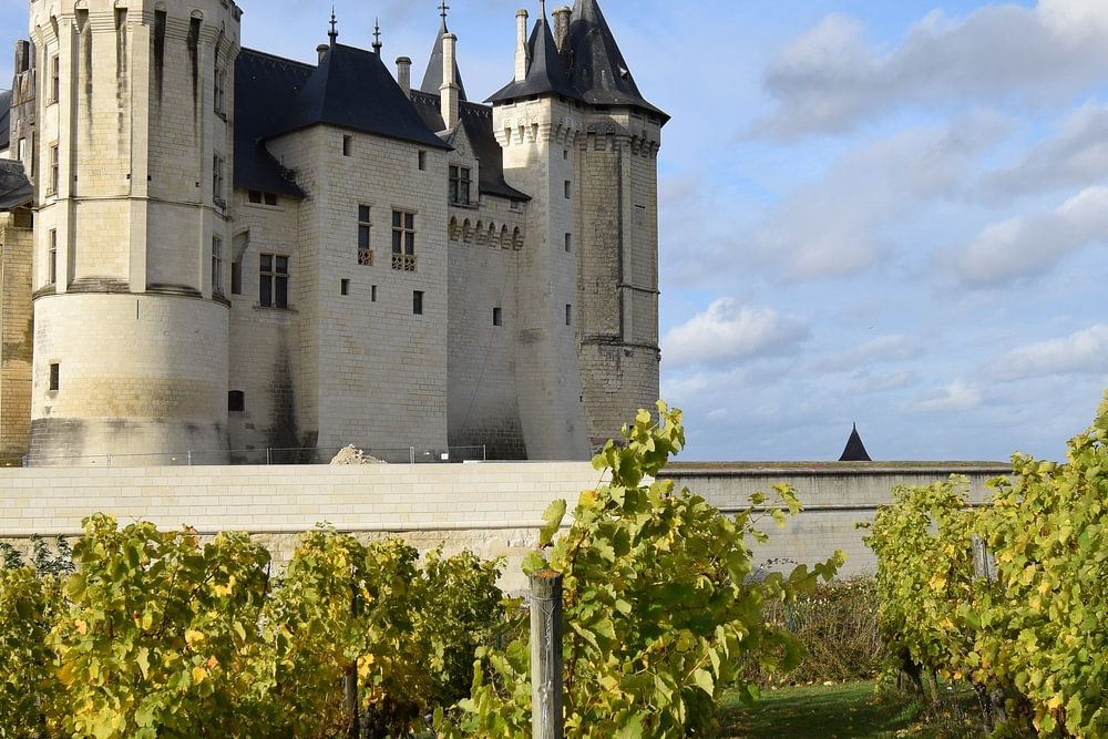 Château français avec vignoble jaune vif au premier plan - l'automne est visible.