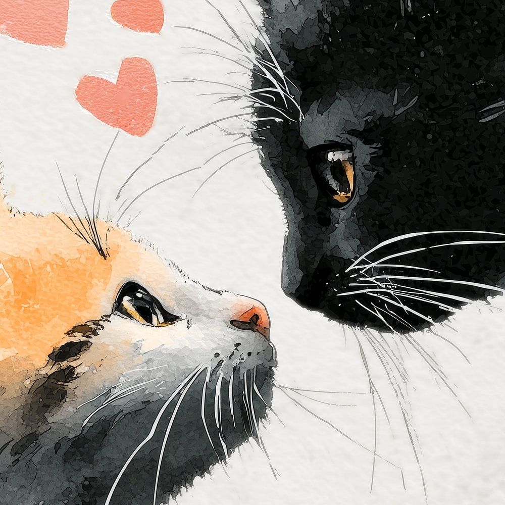 Apportez de la chaleur et de la douceur à votre intérieur avec cette magnifique peinture de deux chatons se regardant amoureusement l'un l'autre. Le style aquarelle donne à l'œuvre un aspect rêveur, peint à la main, tandis que les cœurs subtils entre les chats évoquent un sentiment de connexion et d'affection.