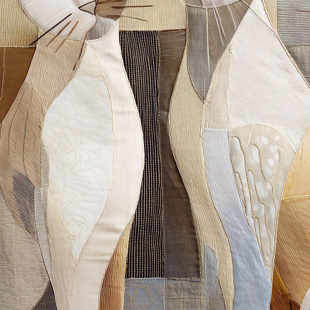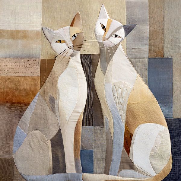 Portrait de deux chats dans des tons naturels et terreux doux. Style quilt brodé.