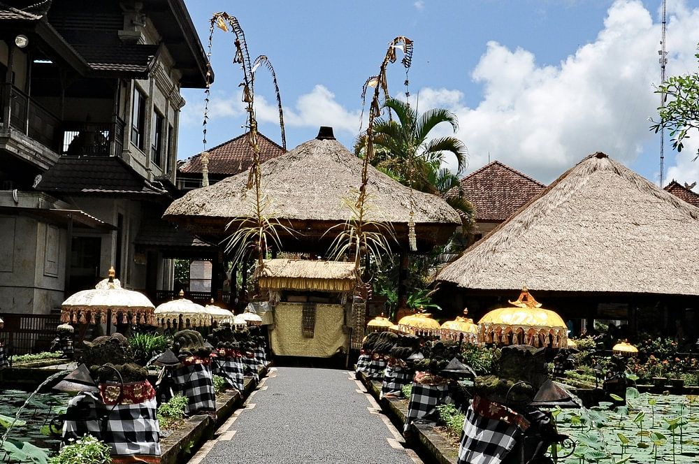 À Ubud, un chemin pittoresque mène à un temple sacré, bordé de statues en pierre finement sculptées et ornées d’ombrelles balinaises colorées. Chaque statue, revêtue de tissus traditionnels, symbolise la protection spirituelle et veille sur les visiteurs en quête de sérénité. L’ambiance est renforcée par la végétation luxuriante environnante, qui offre ombre et fraîcheur. Ce chemin reflète l’importance de la spiritualité et des traditions dans la vie quotidienne balinaise. C’est un lieu où l’art, la nature et la dévotion se rejoignent pour créer une expérience unique, propice à la méditation et à la contemplation.