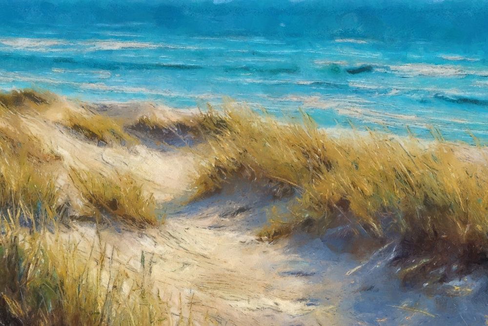 Un sentier dunaire éclairé par le soleil serpente vers une mer scintillante. La végétation est clairsemée mais vigoureuse, avec de l'herbe de marrame jaune paille qui se courbe doucement dans le vent. À l'arrière-plan, l'horizon s'étend clairement, là où l'eau azur rencontre le ciel. Cette œuvre dégage la sensation d'une chaude journée d'été sur la côte néerlandaise, et plus particulièrement l'atmosphère de Texel, où le silence et l'espace se rencontrent.