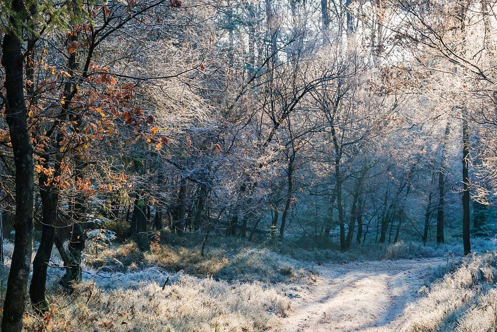 Un sentier forestier gelé dans la Veluwe au début du mois de décembre. Tout est recouvert d'une fine couche de givre... qui crisse sous les pieds, la lumière du soleil faisant de son mieux pour raviver la couleur.