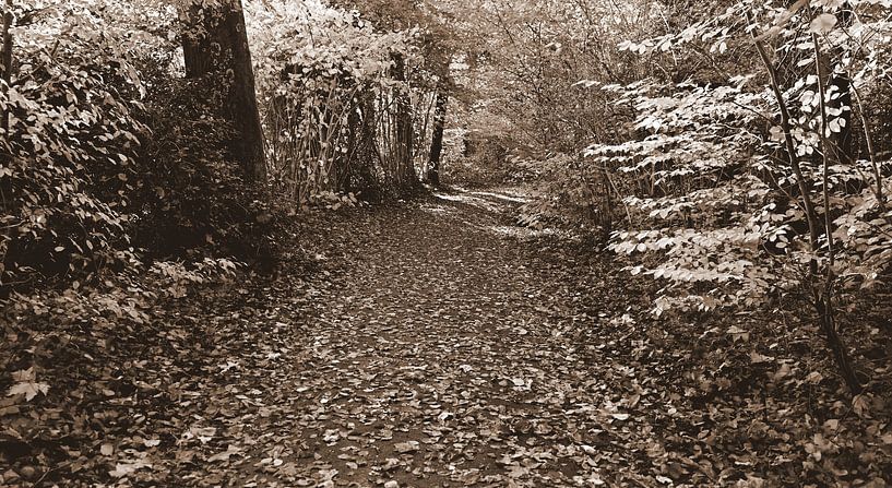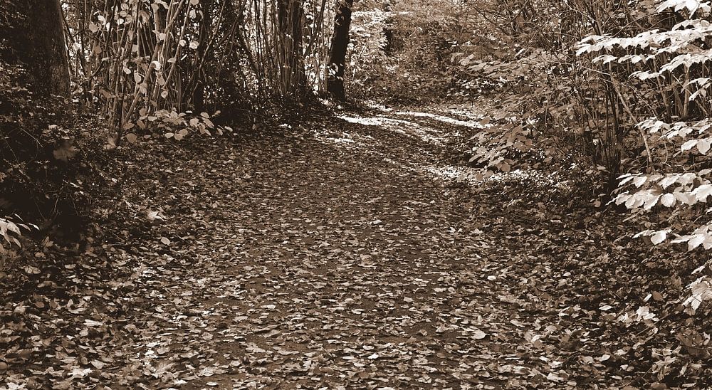 Cette photo montre un sentier forestier couvert de feuilles mortes, entouré d'une végétation dense. La couleur sépia donne à l'image un aspect nostalgique, presque intemporel. Le chemin qui disparaît lentement évoque des sentiments de.. :