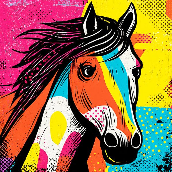 Couleurs et style artistique La palette de couleurs est vive, contrastée et ludique, avec un mélange de teintes chaudes et froides qui se renforcent mutuellement. Les influences pop art sont clairement visibles dans les motifs graphiques, les contours épais et la composition dynamique. Le cheval est représenté de manière stylisée mais reconnaissable, ce qui assure un équilibre parfait entre réalisme et liberté artistique. L'arrière-plan, composé de aplats de couleur, de points et de formes abstraites, confère à l'œuvre un aspect moderne et énergique qui attire immédiatement l'attention.