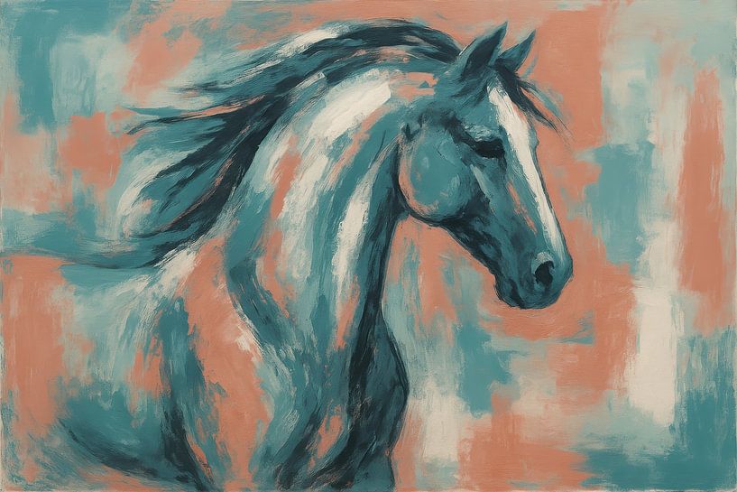 Un portrait puissant du cheval ressort grâce à des coups de pinceau larges et libres qui suggèrent le mouvement. La vue de profil avec la crinière flottant au vent contraste joliment avec les zones de couleur claires dans des tons bleu-vert froid et corail chaud. Les transitions douces alternent avec des lignes fermes, créant ainsi de…