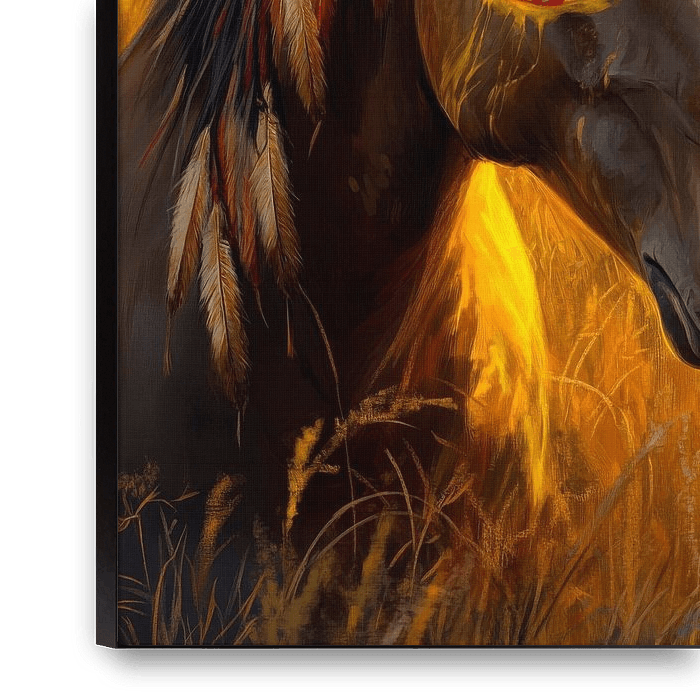 Un cheval majestueux aux yeux rouge vif et orange, entouré de champs dorés, dégage une aura mystique. Le coucher de soleil baigne la scène d'une lumière chaude et met en valeur les crinières en mouvement, tandis que l'ornementation particulière au niveau des yeux éveille la curiosité et incarne le lien entre nature et spiritualité.