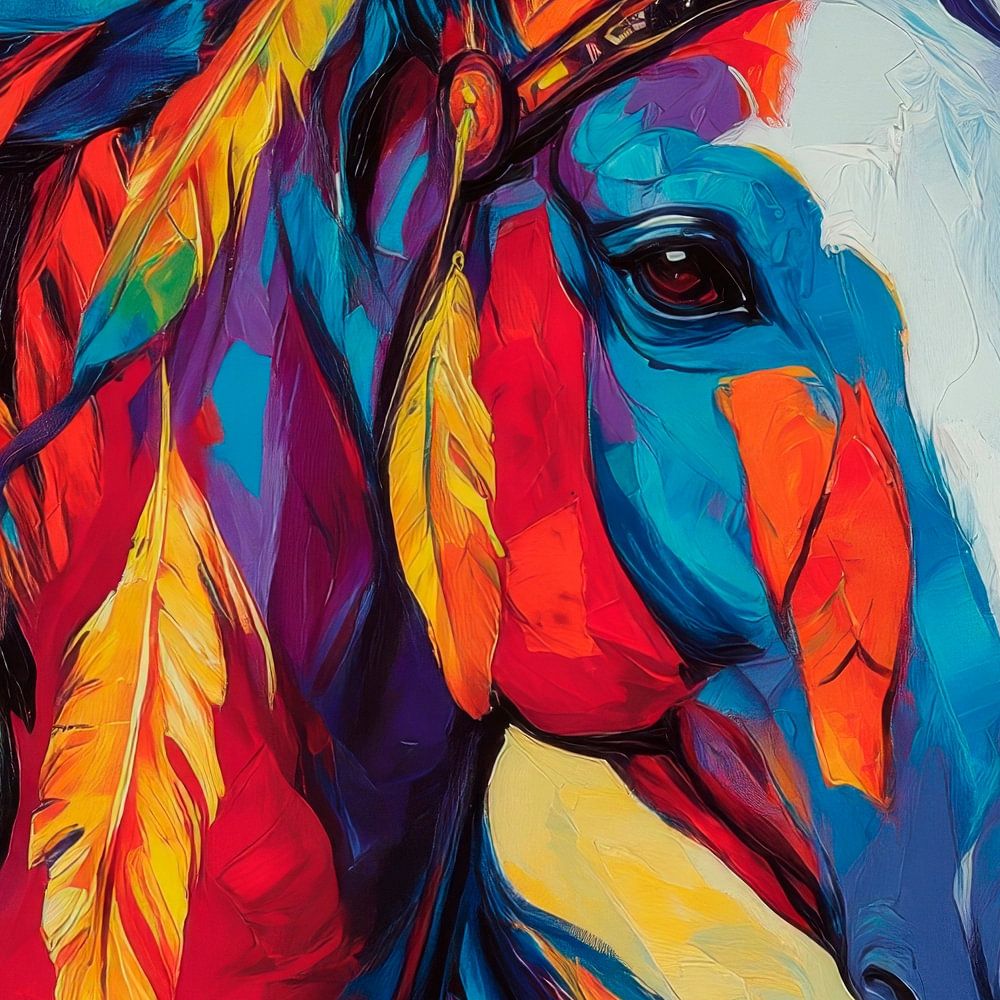 Un être puissant, rayonnant de couleurs vives, fascine le spectateur. Les plumes soigneusement conçues dans des tons rouges et jaunes éclatants lui confèrent une aura majestueuse. En contraste avec la crinière dynamique, le visage brille dans des tons bleus et orange intenses, ce qui crée une combinaison harmonieuse d'énergie et de grâce.