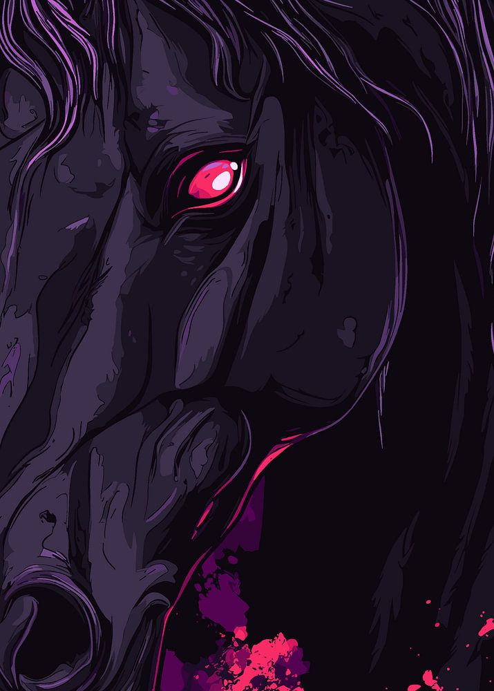 Ce graphique impressionnant montre la tête d'un cheval noir avec un œil rouge flamboyant. La représentation détaillée de la crinière dans les tons violets confère à l'animal un rayonnement mystique. Entourée d'éclaboussures de peinture rose et violette, l'image est dramatique et puissante. L'arrière-plan sombre renforce le contraste et met encore plus en valeur l'intensité des couleurs. La combinaison d'une anatomie réaliste et d'un style de couleur expressif rend ce motif particulièrement marquant.