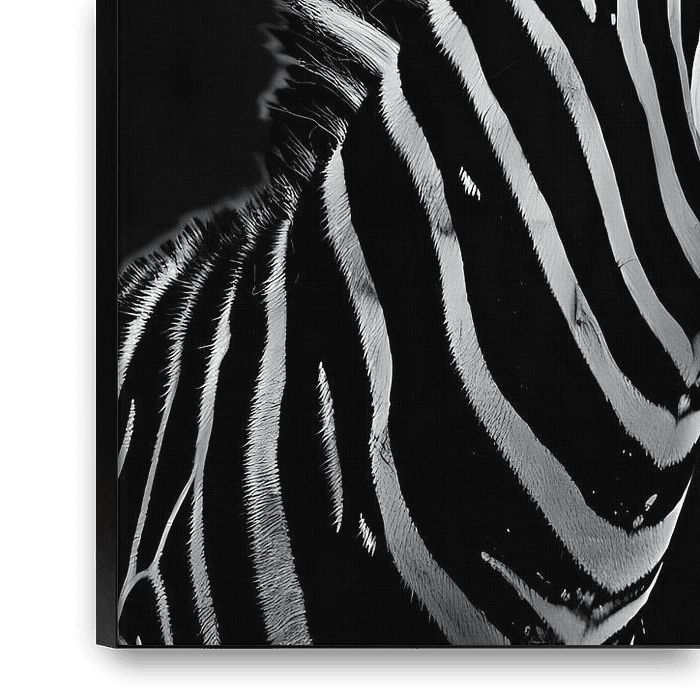 La photo en noir et blanc montre un zèbre majestueux sur un fond noir. Les rayures contrastées de sa fourrure ressortent nettement, faisant ressortir clairement chaque ligne. Ses yeux sont calmes mais observateurs, tandis que la lumière projette des ombres subtiles, soulignant la profondeur et la texture de sa fourrure. Le fond noir…