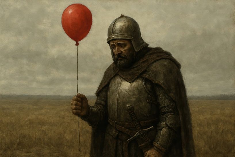 Un chevalier solitaire en armure tient un ballon rouge sur une vaste plaine sous un ciel couvert. Le métal brillant et le rouge éclatant forment un contraste puissant, tandis que l'horizon s'estompe dans des tons de terre doux. Des textures fines comme des pinceaux et des ombres subtiles renforcent l'atmosphère mélancolique et poétique.…