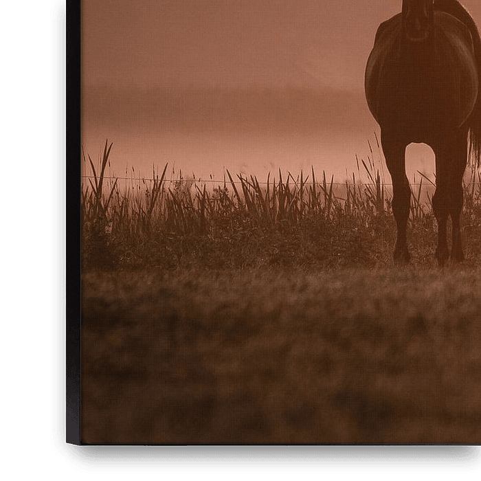 Achetez cette photo Chevaux au lever du soleil brumeux par Yorben de Lange sur toile, aluminium, ArtFrame ou photographie (encadrée), impression d'art en haute qualité et tout format.